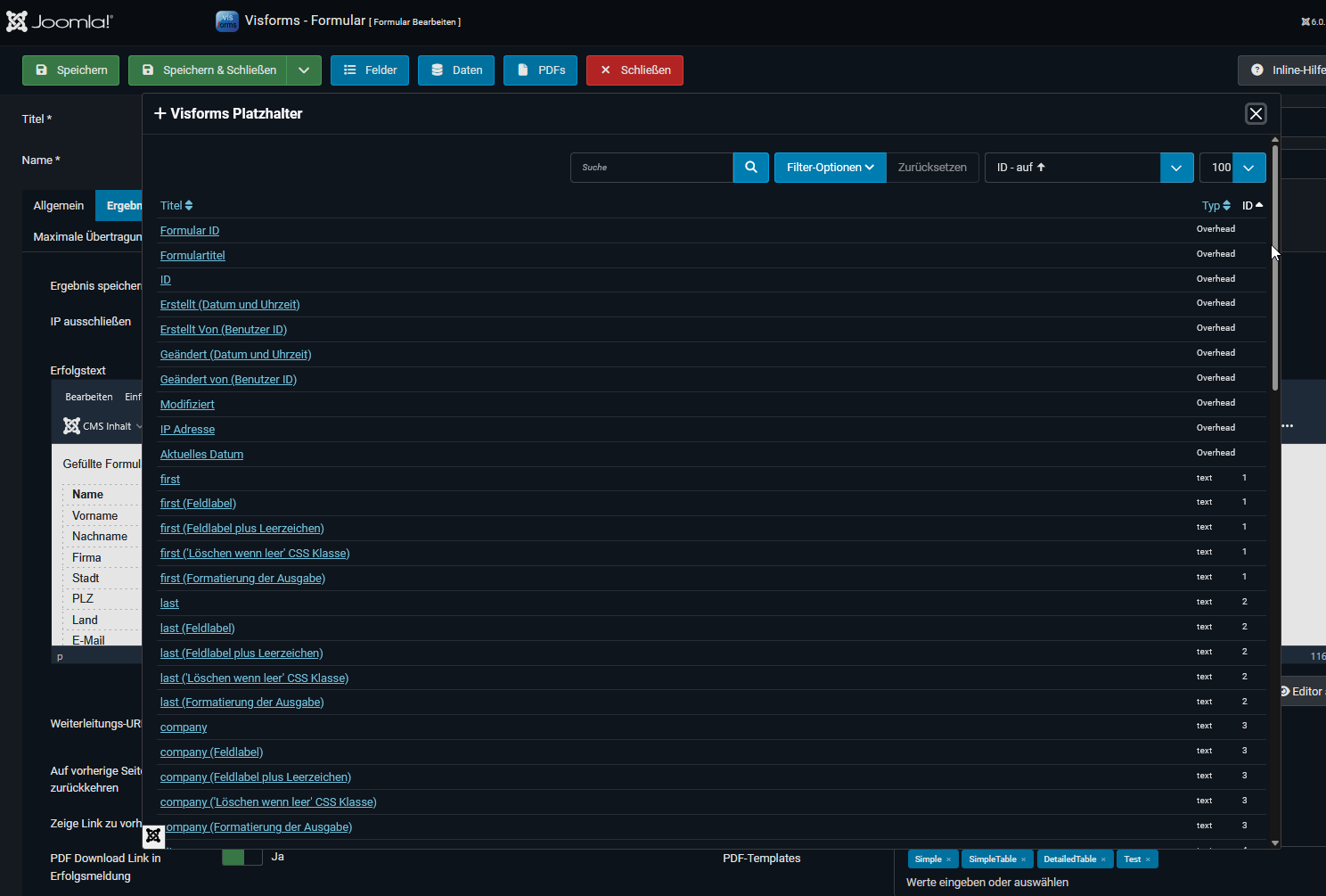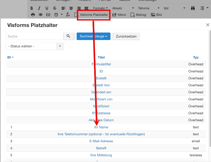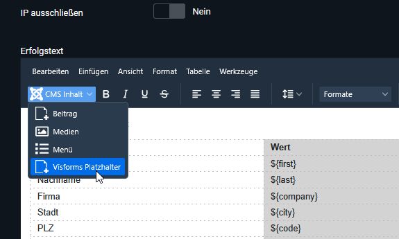 Es erscheint die Liste aller zur Verfügung stehenden Platzhalter automatisch: